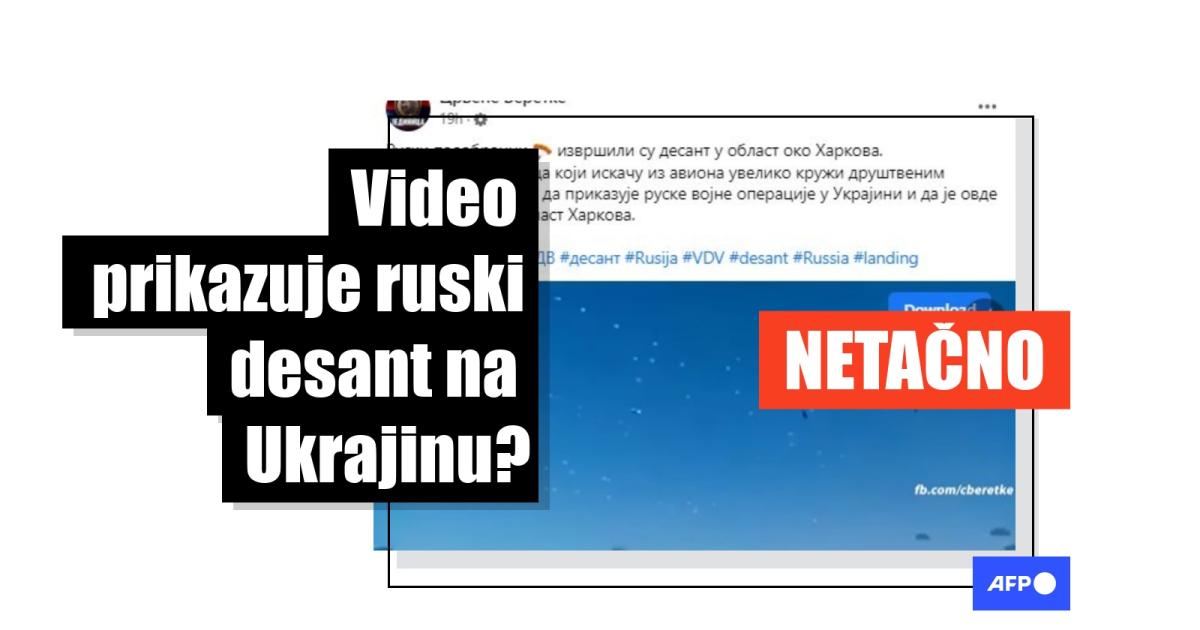 "Ruski padobranci izvršili su desant u oblast oko Harkova," navodi se u objavi na srpskom uz koju je podeljen video koji prikazuje padobrance kako se spuštaju sa vedrog neba. Jedan korisnik je napisao "Ruski padobranci" i podelio Jutjub video pod naslovom "Ruski vojni padobranci se spuštaju u Ukrajinu, blizu Harkova".