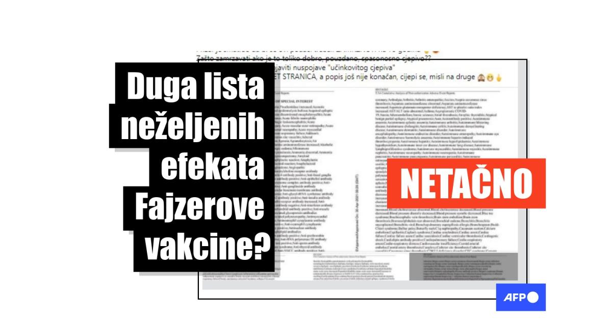To, međutim, nije tačno. Nekoliko stručnjaka reklo je AFP-u da se lista odnosi samo na unapred određene štetne događaje koje su posmatrane tokom utvrđivanja bezbednosti, ne nuspojava vakcine.
