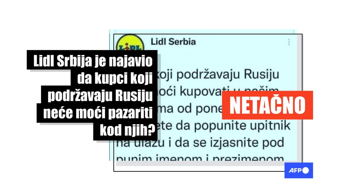 "Kupci koji podržavaju Rusiju neće moći kupovati u našim objektima od ponedeljka. Moraćete da popunite upitnik na ulazu i da se izjasnite pod punim imenom i prezimenom," piše na slici koja izgleda kao loša imitacija tvita pripisanog kompaniji "Lidl Serbia", a koja je objavljena 20. marta 2022. u Fejsbuk grupi protiv vakcinacije i drugih ograničenja za zaustavljanje širenja kovida-19. Objava je podeljena 126 puta za tri dana.