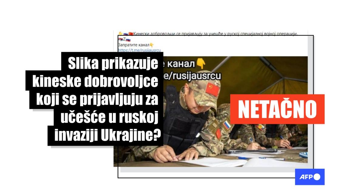 Na fotografiji se vidi nekoliko ljudi u šatoru u vojnim uniformama na kojima su zastave Kine i Ruske Federacije. Neki od njih potpisuju papire. Slika je podeljena u srpskim grupama na Fejsbuku krajem jula 2022, uz tvrdnju da se ti ljudi dobrovoljno "prijavljuju" da se bore sa Rusijom u okviru njene invazije na Ukrajinu, na primer ovde i na Telegramu ovde.
