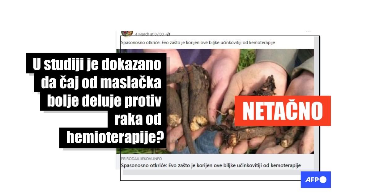 "Spasonosno otkriće: Evo zašto je korijen ove biljke učinkovitiji od kemoterapije," piše u naslovu na hrvatskom. "Naučnici su otkrili da korijen ove biljke djeluje 'bolje' od hemoterapije, jer ona 'ubija' sve ćelije, a korijen maslačka samo zahvaćene karcinomom," piše u tekstu, uz citat studije koju su naučnici sa univerziteta Vindsor (Windsor university) sprovodili u Kanadi.