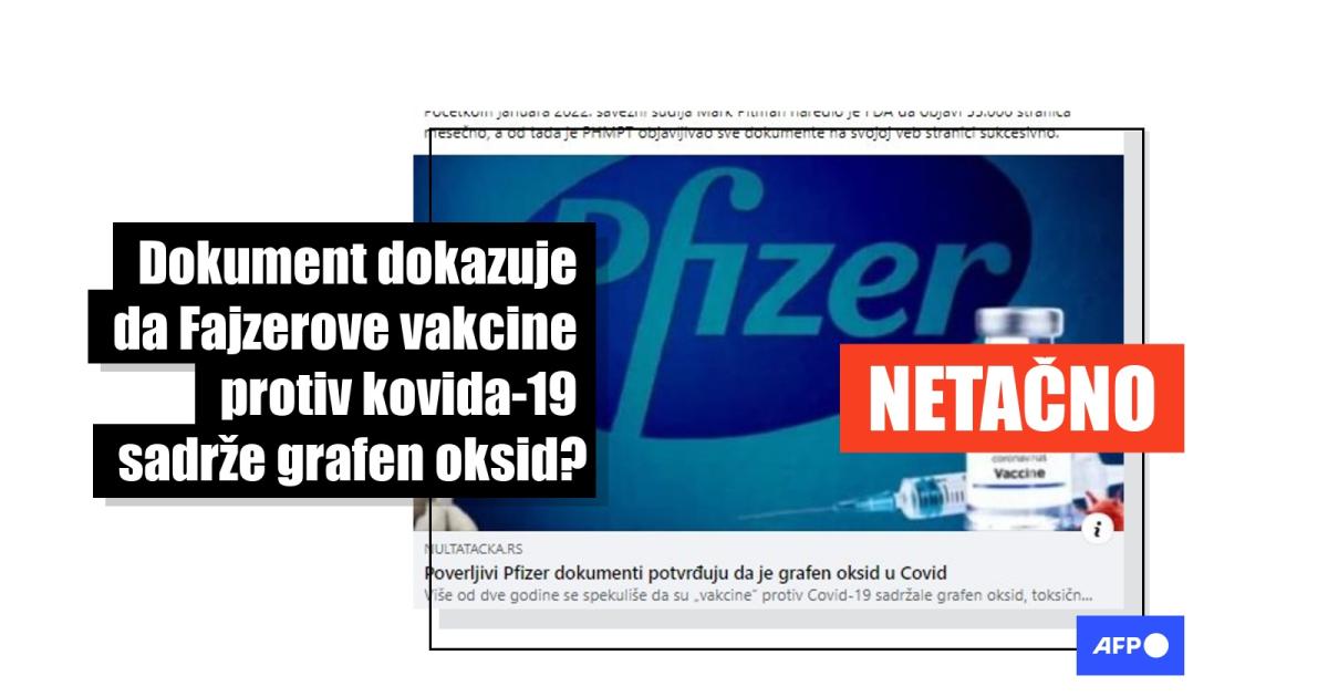 U članku, podeljenom na Fejsbuku nekoliko desetina puta i pregledanom na Telegramu više od 6.000 puta, prikazan je dokument na čijem je vrhu logo Fajzera a koji navodno dokazuje da vakcine protiv kovida-19 ove farmaceutske kompanije sadrže grafen oksid.