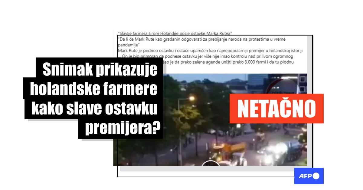 Snimak je, međutim, zabeležen godinu dana ranije tokom jednog od mnogih protesta poljoprivrednika zbog vladinih mera za smanjenje emisije azota, uključujući potencijalno zatvaranje farmi, pokazalo je istraživanje AFP-a. AFP nije mogao da pronađe zapise o velikim proslavama poljoprivrednika usled Ruteove ostavke.