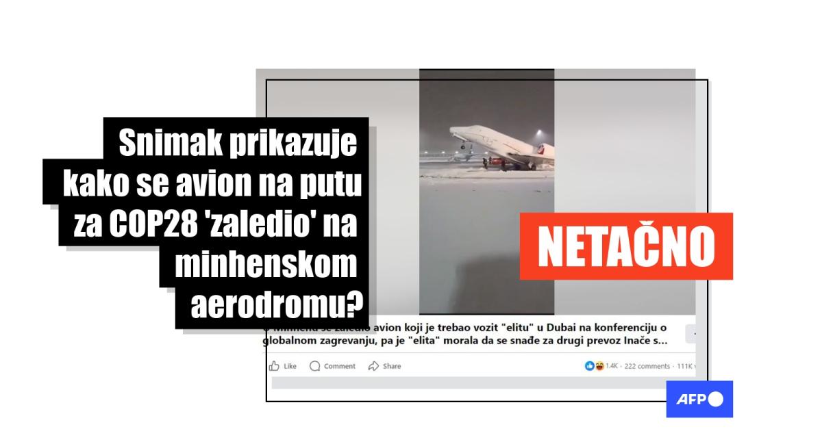 "U Minhenu se zaledio avion koji je trebao vozit 'elitu' u Dubai na konferenciju o globalnom zagrevanju, pa je 'elita' morala da se snađe za drugi prevoz," piše u opisu snimka objavljenog na Telegramu 3. decembra 2023. Ko je tačno ta "elita" nije objašnjeno. Na snimku se vidi kako se avion prevrnuo pod velikom količinom snega. Vidi se i nekoliko vozila vatrogasne službe i hitne pomoći sa upaljenim plavim svetlima. Podeljen je i na Fejsbuku sa sličnom tvrdnjom i uz ismevavanje učesnika konferencije, kao na primer u ovoj objavi postavljenoj 5. decembra 2023. i podeljenoj preko 200 puta za tri dana. Tvrdnja cirkuliše i na drugim jezicima poput nemačkog, engleskog i kineskog.