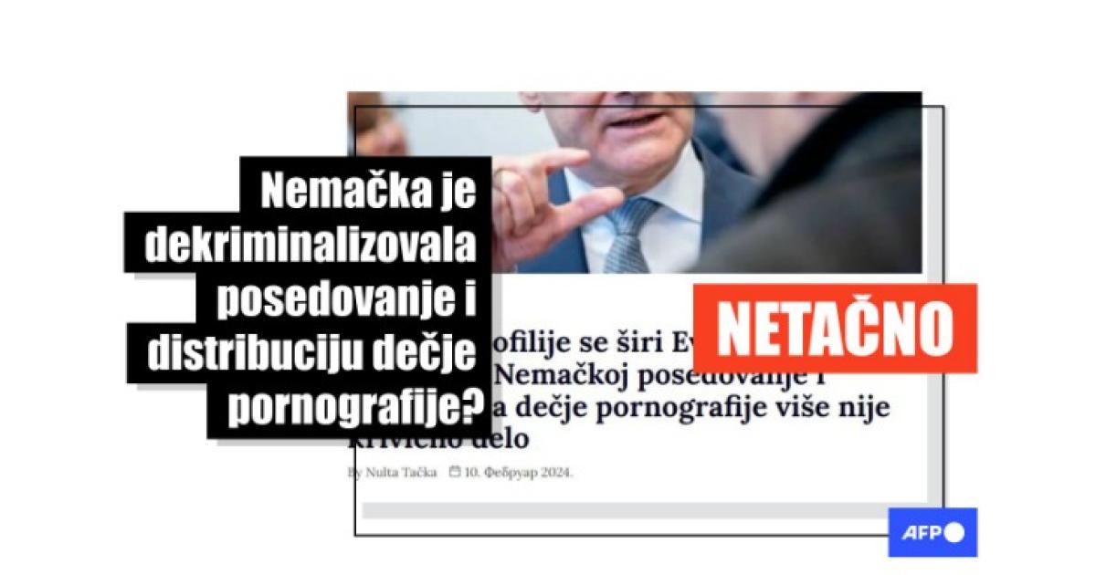 "U Nemačkoj posedovanje i distribucija dečje pornografije više nije krivično delo," piše u naslovu teksta objavljenog na srpskom 10. februara 2024. Linkovi do tog teksta i skrinšotovi naslova su podeljeni na desetine puta na društvenim mrežama poput Fejsbuka ovde i ovde ili na Telegramu ovde u postu koji je pregledan više od 6.300 puta za par dana, kao i ovde na Eksu.