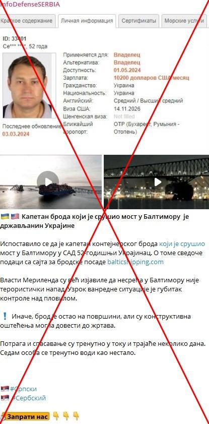 Post na Telegramu na srpskom jeziku, u kojem je podeljen profesionalni profil čoveka za koga se tvrdi da je kapetan broda, imao je više od 5.000 pregleda. "Kapetan broda koјi јe srušio most u Baltimoru јe državljanin Ukraјine", piše u postu. Slične tvrdnje pojavile su se i na Fejsbuku na srpskom i bosanskom jeziku, na primer ovde i ovde.