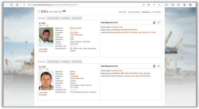 Na postovima sa netačnim tvrdnjama objavljen je i skrinšot onlajn profila preuzetog sa sajta Baltik Šiping (Baltic Shipping), međunarodne službe za zapošljavanje pomoraca. Profil se odnosi na dva muškarca koji su nekada radili na brodu Dali. Za drugog se navodi da je Ukrajinac i da ima ukrajinsko državljanstvo.