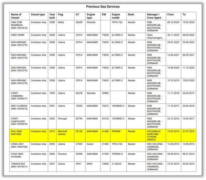 Arhivirana kopija njegove radne biografije na sajtu Baltic Shipping takođe pokazuje da je radio na brodu Dali od 19. marta do 27. jula 2016. godine. Poslednje navedeno plovilo na kojem je radio i to do 19. februara 2024. godine bilo je CMA CGM MOMBASA (arhivirano ovde).