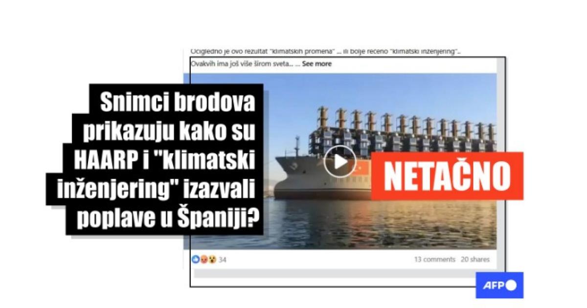 Video broda snimljenog izdaleka, na kojem se čuje ženski glas na španskom, podeljen je na Telegramu i u postu na Fejsbuku na hrvatskom jeziku, uz tvrdnju da prikazuje "elektranu" uočenu neposredno pre poplava u blizini Valensije. U postovima na srpskom jeziku, objavljenim na Fejsbuku, na snimku je dodat tekst: "HAARP brod uočen na obali Španije." Slika jednog broda takođe kruži Fejsbukom uz tvrdnju da prikazuje "Crnomorski energetski brod Osman Knan u službi hA.RpA skoro izazvao poplave u Valensiji i zemljotres u Turskoj prije 2 god."