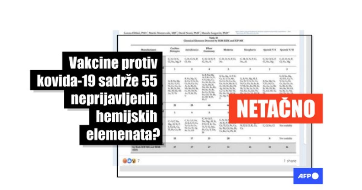 Vakcine protiv kovida-19 pokazale su se sigurnim i odigrale ključnu ulogu u spašavanju života tokom pandemije. Međutim, sredinom oktobra 2024. godine korisnici društvenih mreža počeli su da dele studiju u kojoj se netačno tvrdi da vakcine protiv kovida-19 sadrže najmanje 55 neprijavljenih i opasnih hemijskih elemenata. Uprkos ovim viralnim tvrdnjama, studija ima značajne metodološke nedostatke, što su za AFP potvrdila i dva stručnjaka, a objavljena je u časopisu bez faktora uticaja, kako je utvrdio AFP. Sve vakcine spomenute u ovoj studiji odobrile su regulatorne agencije širom sveta i sigurne su za ljudsko telo, što potrvrđuju brojna istraživanja.
