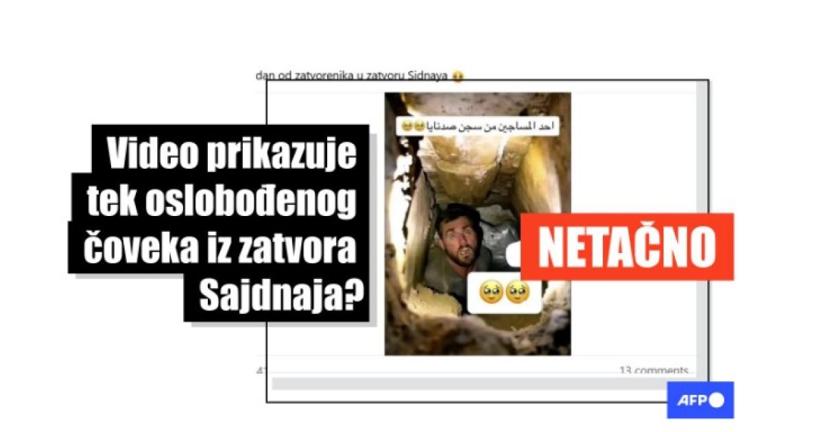 "Nije scena iz filma. On je jedan od zatvorenika u zatvoru Sidnaya", piše u postu na bosanskom jeziku, podeljenom na Fejsbuku 10. decembra 2024. godine, koji je u roku od nekoliko dana prikupio stotine reakcija. U postu je priložen i video u kome se vidi iscrpljen i uplašen čovek kako izlazi iz rupe.