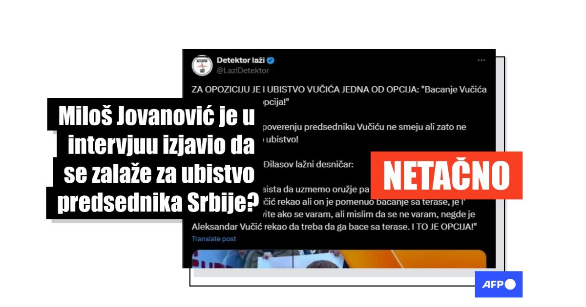 "ZA OPOZICIJU JE I UBISTVO VUČIĆA JEDNA OD OPCIJA: "Bacanje Vučića sa terase? I to je opcija!" piše u postu objavljenom na Eksu 18. januara 2025. U postu se nalazi kratak video iz intervjua predsednika Nove Demokratske Stranke Srbije Miloša Jovanovića isečen na obmanjujući način tako da izgleda da je Jovanović rekao da je uzimanje oružja i "bacanje predsednika sa terase" opcija da se izađe iz krize koja traje gotovo tri meseca otkad je 15 ljudi poginulo u padu nadstrešnice u Novom Sadu (arhivirano ovde).