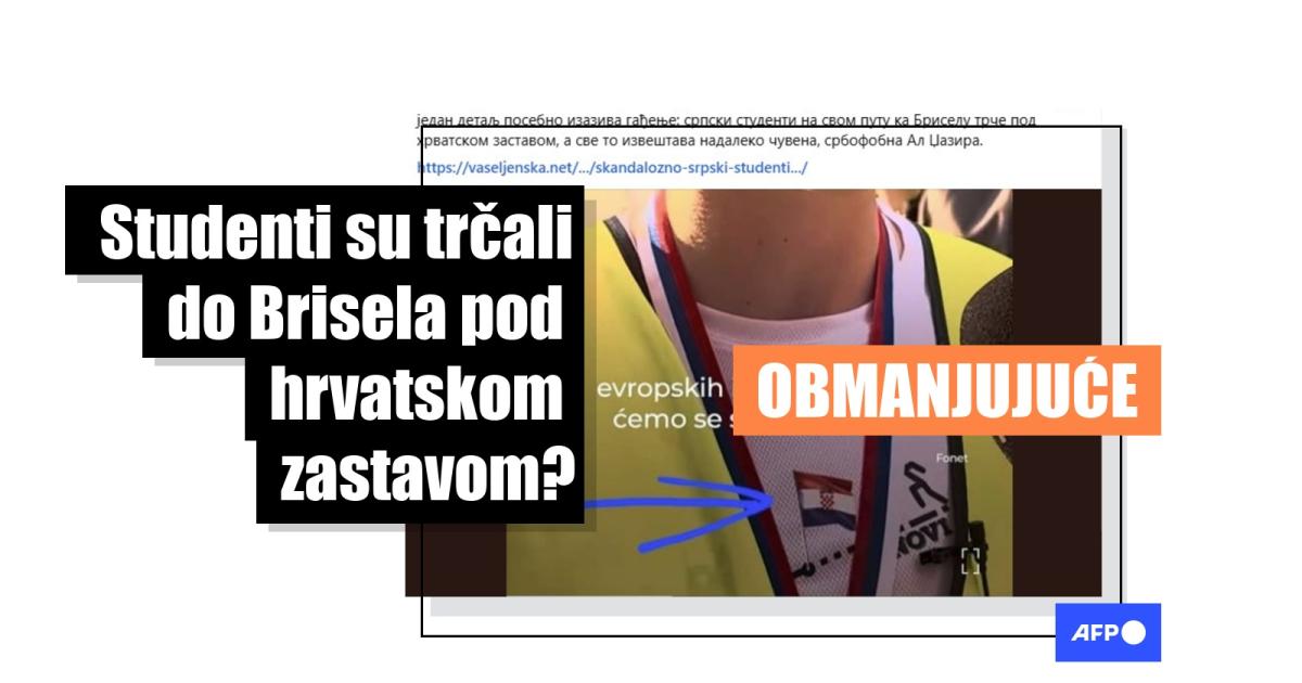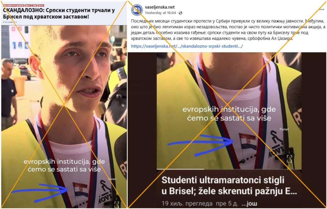 "SKANDALOZNO: Srpski studenti trčali u Briselu pod hrvatskom zastavom!" piše u naslovu članka objavljenog na sajtu Vaseljenska 19. maja 2025. Tekst sadrži skrinšot video izveštaja Al-Džazire o dolasku srpskih studenata u Brisel 12. maja, konačno odredište u okviru štafetnog ultramaratona od Srbije do institucija EU, organizovanog kao deo višemesečnih studentskih protesta a kako bi se EU skrenula pažnja na događaje u Srbiji (arhivirano ovde i ovde).