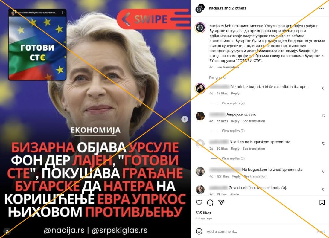 "Bizarna objava Ursule Fon Der Lajen, 'gotovi ste', pokušava građane Bugarske da natera na korišćenje evra uprkos njihovom protivljenju," piše u opisu slike objavljene na Instagramu 5. juna 2025. koja je dobila preko 500 lajkova za četiri dana.