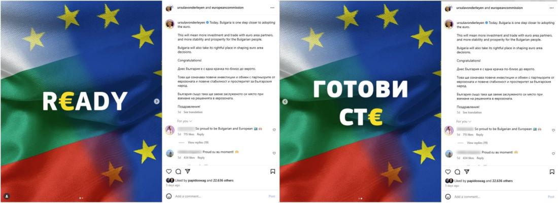 Na slici se nalazi fotografija predsednice Evropske komisije Ursule fon der Lajen i skrinšot posta objavljenog na njenom zvaničnom nalogu na Instagramu 4. juna na kojem se vide poruka "Gotovi st€" i zastave Bugarske i Evropske unije.