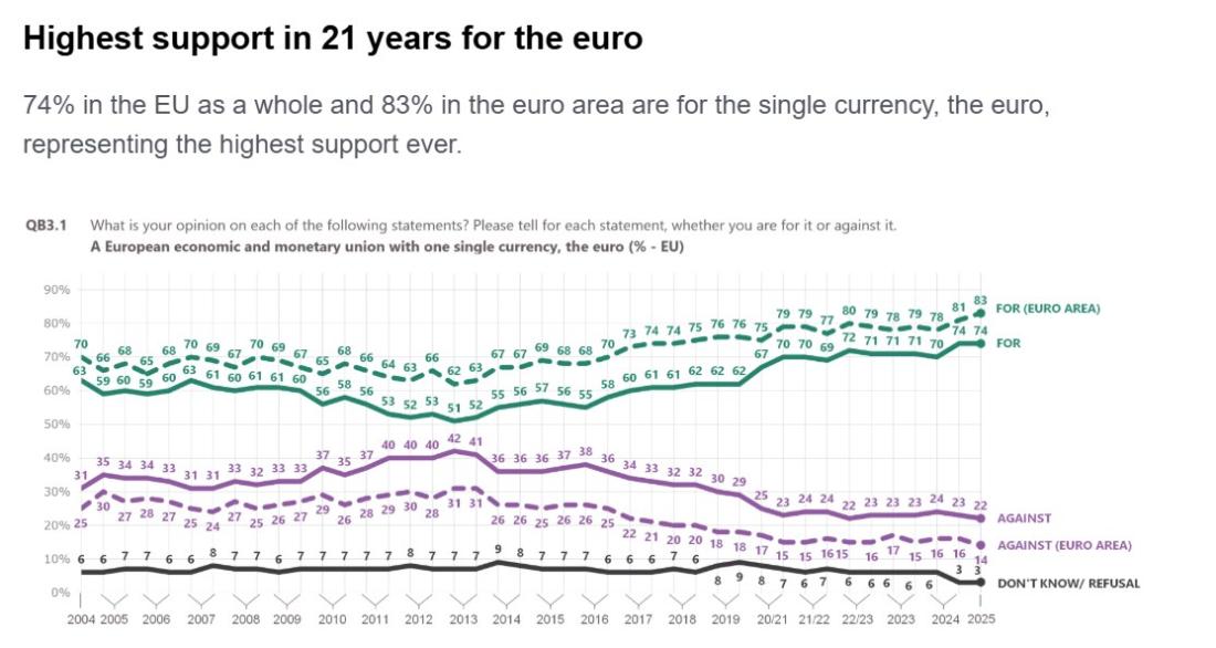 Anketa Eurobarometra u proleće 2025. potvrdila je da ogromna većina stanovništva u zemljama EU koje koriste evro podržava evrozonu, uključujući i male zemlje poput Slovačke, Slovenije kao i baltičke države (strana 165 u aneksu barometra).
