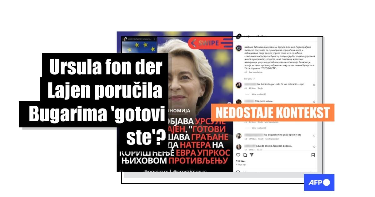 Evropska unija potvrdila je početkom juna 2025. da je Bugarska spremna da postane 21. član evrozone. Deo bugarskog stanovništva se protivi ovom sledećem koraku evropske integracije zbog straha od inflacije ili nacionalističkih razloga. Međutim, u postu na srpskom se netačno tvrdi da je predsednica Evropske komisije Ursula fon der Lajen "bizarno" izjavila da su Bugari prilikom ulaska u evrozonu "gotovi". Izraz "gotovi ste" na bugarskom nema isto značenje kao na srpskom, nego znači "spremni ste", što je zvanični stav Evropske komisije o pripremi Bugarske da uvede evro.