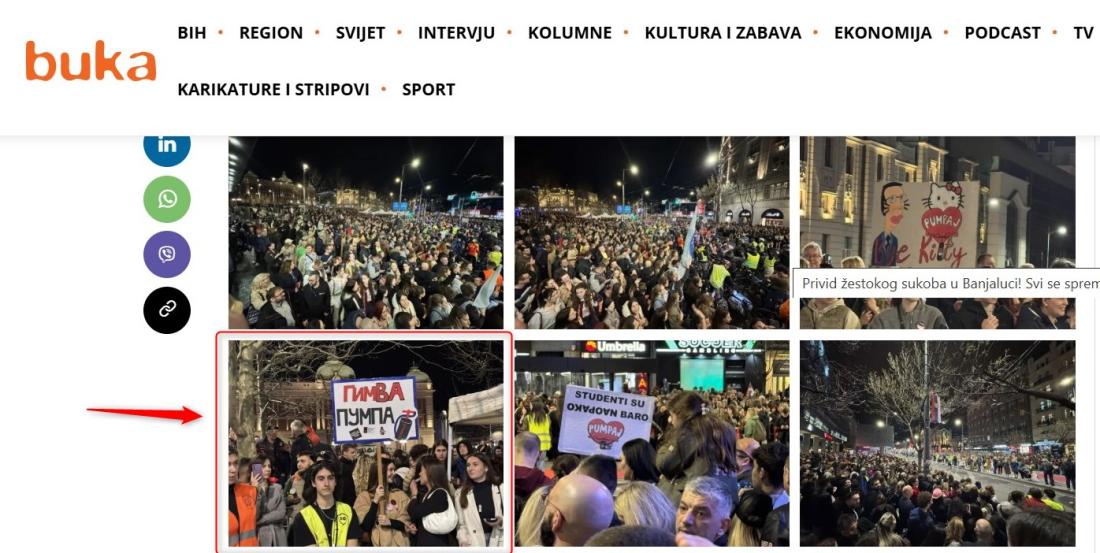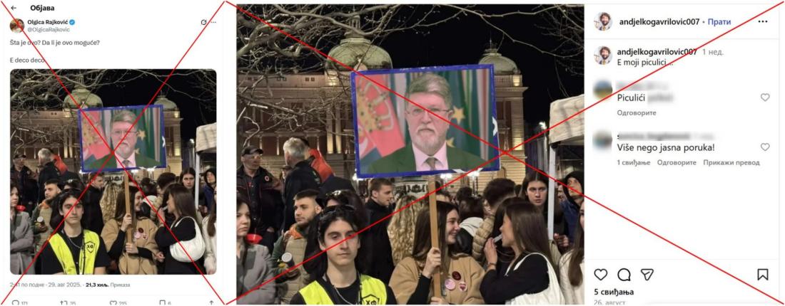 Protesti protiv korupcije u Srbiji, koje predvode studenti i koji su započeli u novembru 2024. nakon što je 16 ljudi poginulo u urušavanju nadstrešnice na železničkoj stanici u Novom Sadu, redovno su meta dezinformacija. Kako bi diskreditovali učesnike, članovi i pristalice vladajuće stranke često ih nazivaju "ustašama" i optužuju da po nalogu Hrvatske pokušavaju da izvedu "obojenu revoluciju". Najnoviji primer je fotografija na kojoj demonstranti navodno drže transparent sa slikom hrvatskog poslanika u Evropskom parlamentu Tonina Picule. Međutim, slika je izmenjena, a originalnu je snimio novinar portala Buka, koji je za AFP potvrdio da na njoj nema Picule.