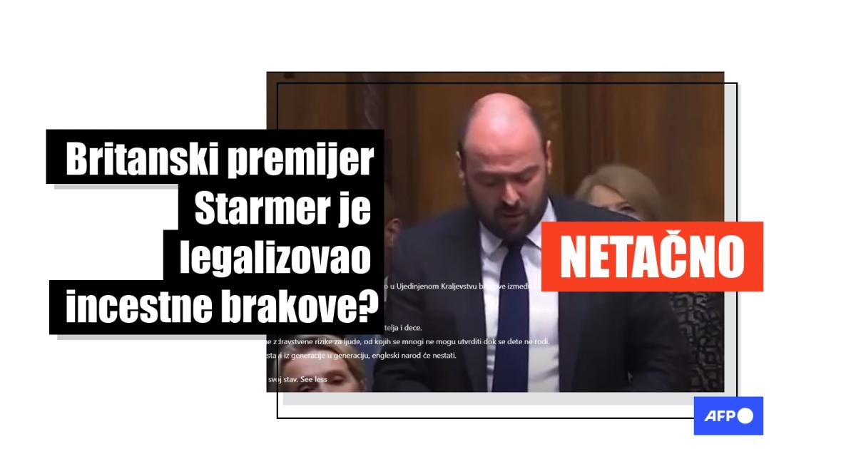 Brak između prvih rođaka vekovima je legalan u Velikoj Britaniji, kao i u nekim drugim evropskim zemljama. Uprkos tome, na internetu kruži video koji prikazuje britanskog premijera Kira Starmera kako odbija da podrži predlog o zabrani brakova između prvih rođaka. Video je pregledan nekoliko hiljada puta i podeljen na raznim jezicima, uključujući i srpski, uz netačnu tvrdnju da je on "legalizovao" incest na zahtev muslimanske zajednice. U pojedinim objavama čak se i netačno tvrdilo da je on legalizovao brakove između "braće i sestara, očeva i ćerki, sinova i majki". Zapravo snimak prikazuje Starmera kako u martu ove godine odbija predlog jednog opozicionog poslanika o zabrani brakova između prvih rođaka. Prema britanskom zakonu, u oktobru 2025. brakovi između bliskih srodnika navedenih u objavama i dalje su nezakoniti.