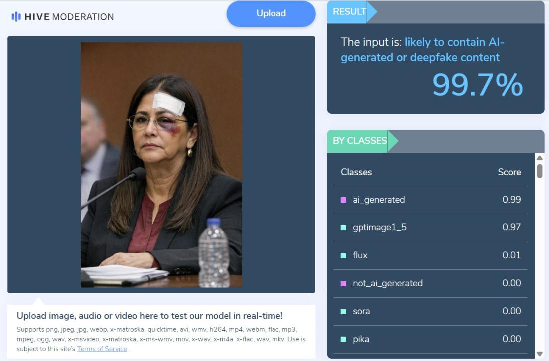 Alat za detekciju veštačke inteligencije kompanije Hive Moderation pokazao je da postoji 99,7% verovatnoće da slika "sadrži sadržaj generisan veštačkom inteligencijom ili dipfejk".