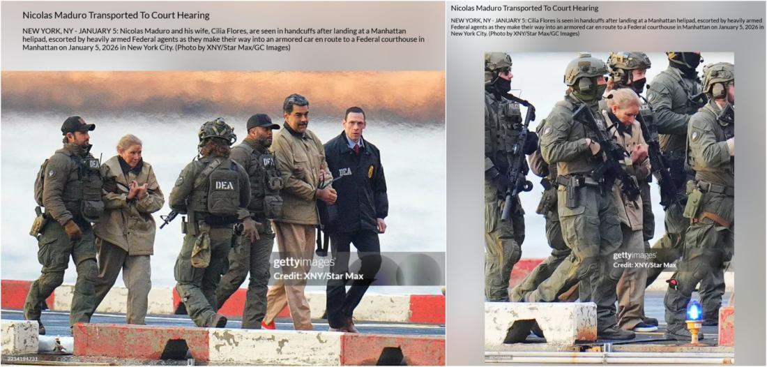 Iako iz sudnice nisu objavljene zvanične fotografije ovog para, više medija je objavilo snimke Madura i Flores tokom njihovog sprovođenja do suda, uključujući i fotografije koje je objavio Getty Images (pogledajte skrinšotove ispod). Na tim snimcima možemo videti Flores sa vezanom plavom kosom i, kako izgleda, modricom na čelu.