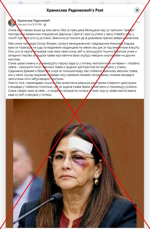 "Ova slika prikazuje Siliju Flores, suprugu venecuelanskog predsednika Nikolasa Madura, kako se pojavljuje na sudu sa vidljivim modricama na levom oku dok je pod američkom vlašću. Ono što je najupadljivije nije samo sama slika, već i zaglušujuća tišina Evropske unije i zapadnih glasova za ljudska prava koji obično brzo osuđuju navodne zloupotrebe na drugim mestima", piše u opisu Fejsbuk posta objavljenog 8. januara 2026. godine.