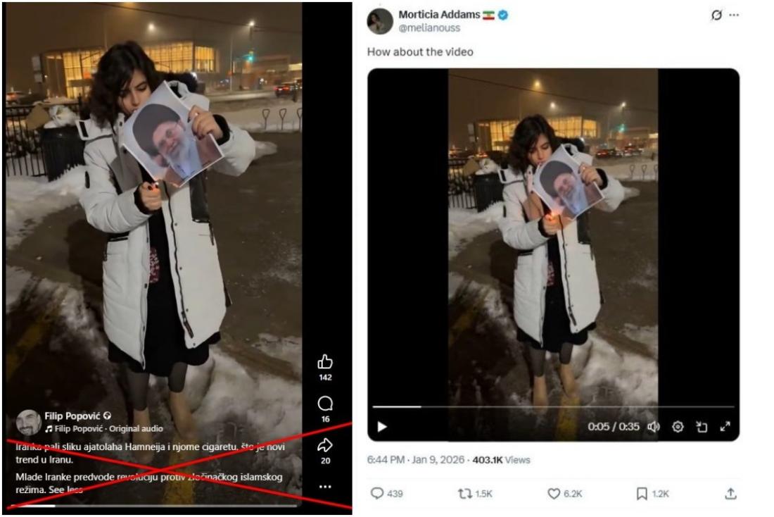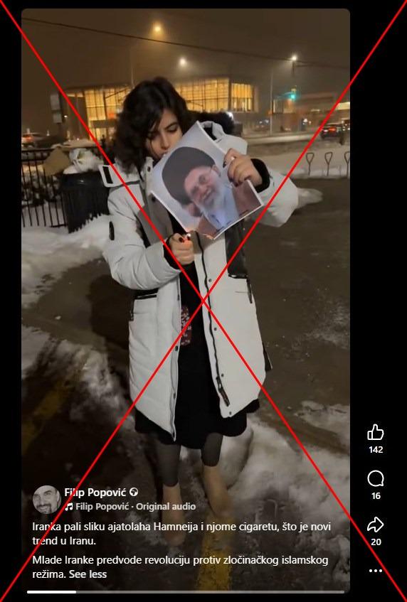 "Iranka pali sliku ajatolaha Hamneija i njome cigaretu, što je novi trend u Iranu. Mlade Iranke predvode revoluciju protiv zločinačkog islamskog režima", piše u opisu posta objavljenog na Fejsbuku 10. januara 2026. godine.