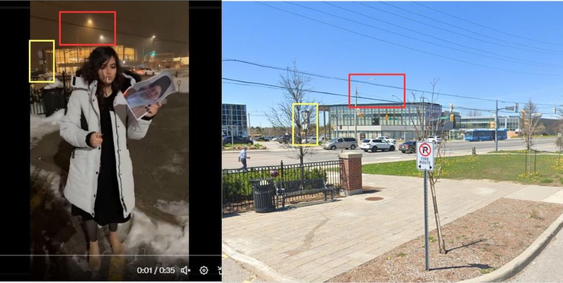 U opisu naloga, žena iz videa navela je kao mesto prebivališta Toronto u Kanadi. To je potvrdila i portugalska organizacija za proveru činjenica Lusa, koja je geolocirala snimak i utvrdila da je video nastao na parkingu u mestu Richmond Hill, u predgrađu Toronta. Detalji u pozadini videa poklapaju se sa snimcima dostupnim na Gugl mapi iz ulične perspektive (Google Street View)