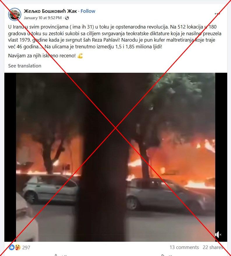 U opisu Eks posta od 10. januara 2026. piše: "1,5 miliona-1,85 miliona Iranaca je večeras u uličnim borbama! Ovo što se dešava u Iranu je REVOLUCIJA, a ne protesti! Revolucija se dešava u: - 512 lokacija - 180 gradova - 31 pokrajina". Post je podeljen više od 200 puta, a sadrži i video koji prikazuje ljude kako trče oko zapaljenih automobila i bacaju nešto na njih.