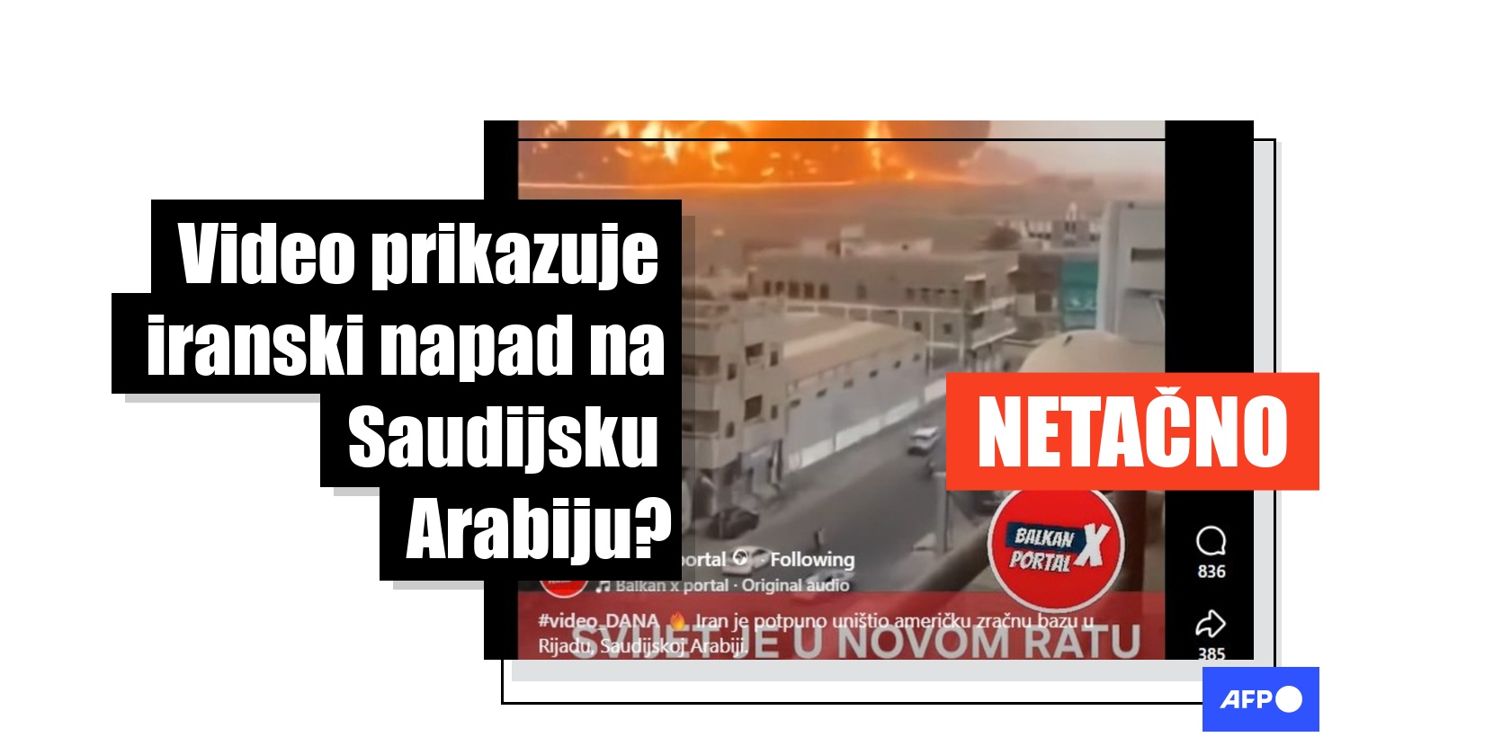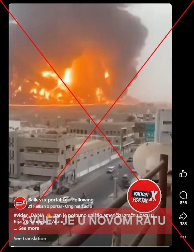 "Iran je potpuno uništio američku zračnu bazu u Rijadu, Saudijskoj Arabiji. Iran napada zemlje Bliskog istoka UAE (Dubai, Abu Dhabi), Bahrein, Izrael itd", piše u opisu posta iz Bosne i Hercegovine objavljenog na Fejsbuku 28. februara 2026.