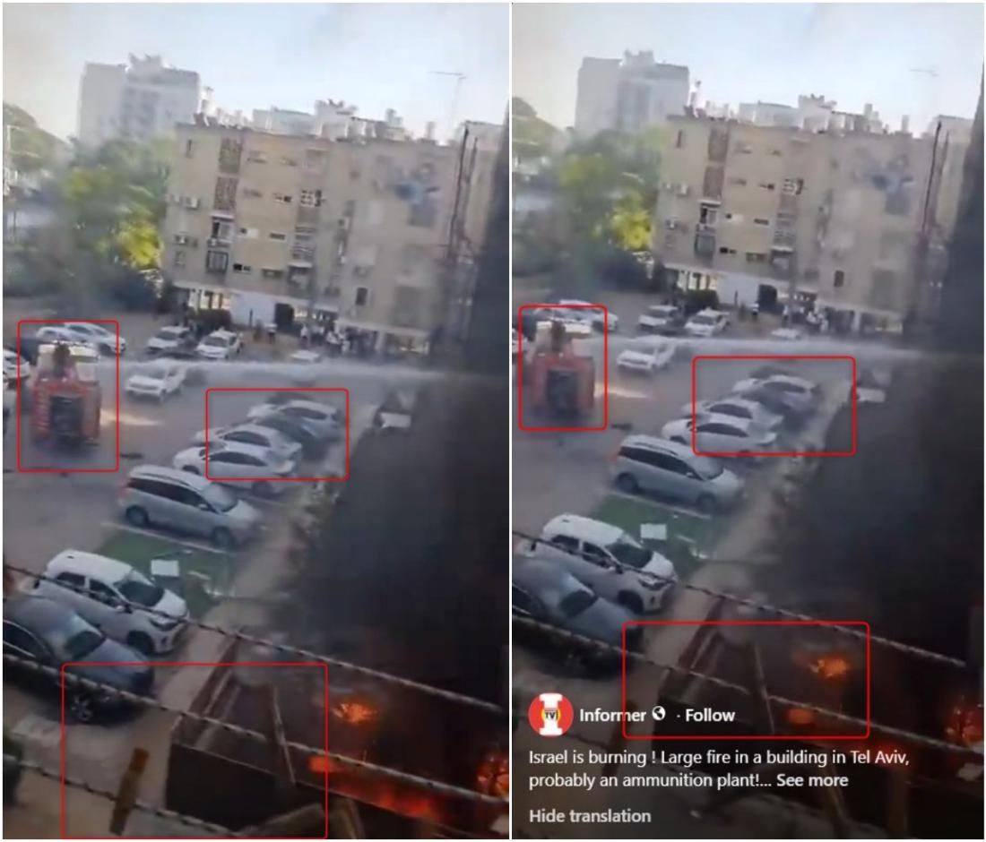 "Izrael gori! Veliki požar u zgradi u Tel Avivu, verovatno sadište municije!", piše u opisu posta objavljenog na Fejsbuku 28. februara 2026. U objavi se nalazi i video snimljen sa balkona stana koji prikazuje plamen kako gori među stambenim zgradama dok vatrogasci pokušavaju da ugase požar.