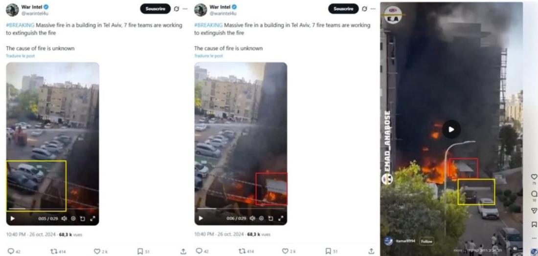 Dalja pretraga pokazala je da je isti video objavljen i na nalogu jednog izraelskog medija na mreži Eks, uz opis: "Požar je izbio u zgradi u ulici Korkidi u Tel Avivu-Jafi, sedam ekipa interveniše na licu mesta".