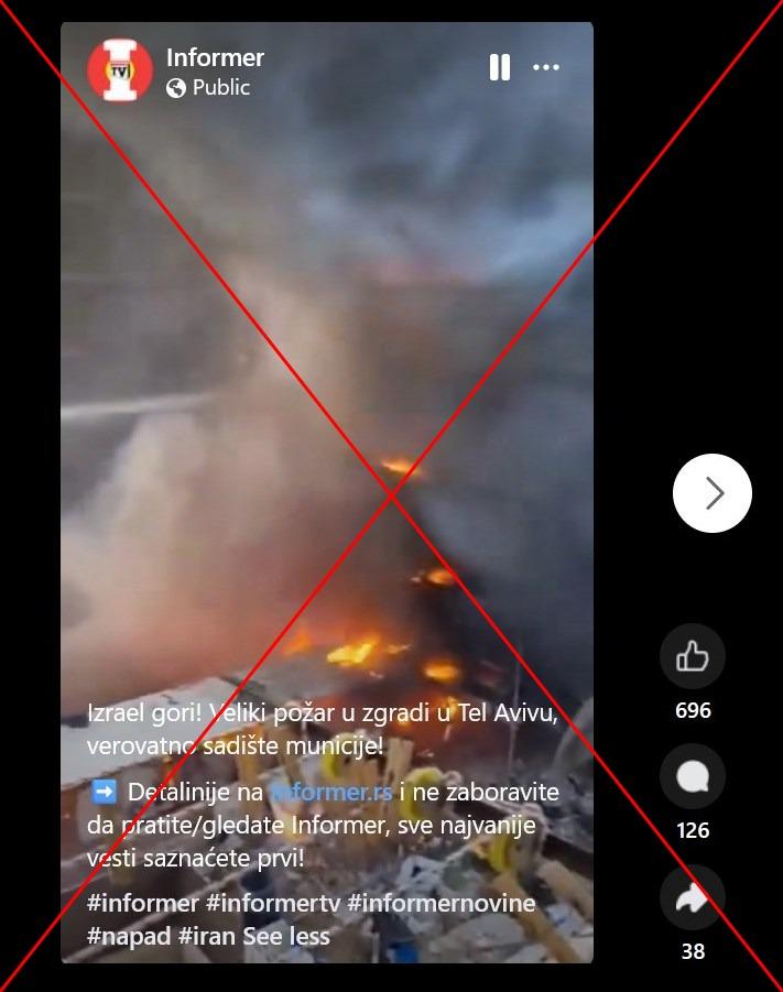 Međutim, kako je pokazala istraga AFP-a, video je snimljen 2024. godine i nije povezan sa ratom na Bliskom istoku. Snimak zapravo prikazuje požar koji je izbio u stambenoj zgradi u Tel Avivu.