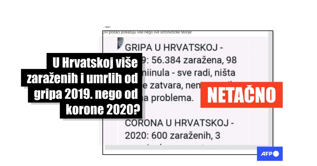 "GRIPA U HRVATSKOJ - 2019: 56.384 zaražena, 98 preminula - sve radi, ništa se ne zatvara, nema panike, nema problema. CORONA U HRVATSKOJ - 2020: 600 zaraženih, 3 preminula - sve zatvoreno, zabrana kretanja, panika, karantena, tisuće problema," navodi se u objavi postavljenoj na Fejsbuku 1. oktobra 2021. Od početka pandemije u martu 2020. korona skeptici i antivakseri pokušavaju da dokažu da Covid-19 nije tako opasan i smrtonosan kako doktori i naučnici tvrde. Podaci, međutim, pokazuju da jeste.