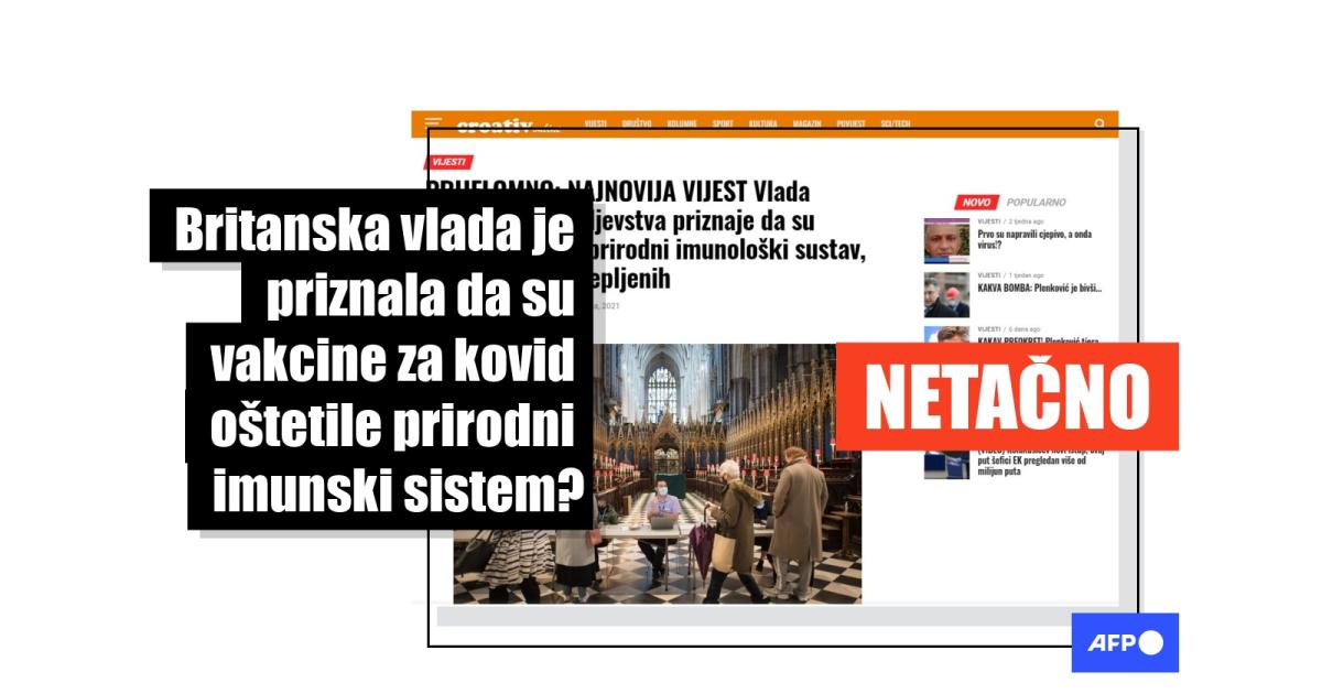 "PRIJELOMNO: NAJNOVIJA VIJEST Vlada Ujedinjenog Kraljevstva priznaje da su cjepiva oštetila prirodni imunološki sustav, kod dva puta cijepljenih," piše u naslovu nekoliko članaka na hrvatskom poput ovog objavljenog 20. decembra 2021. i podeljenog preko 400 puta na Fejsbuku prema podacima alata za praćenje društvenih medija, Kraudtengla (CrowdTangle). Ista tvrdnja je podeljena tokom januara 2022. u objavama na srpskom na Fejsbuku i u drugim člancima.