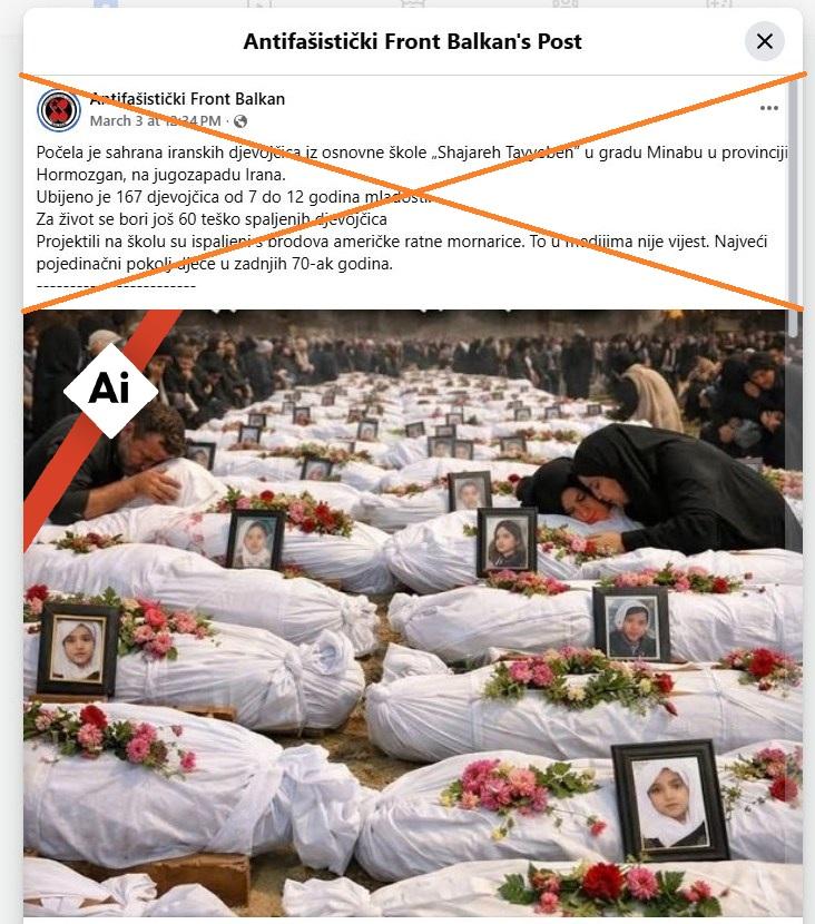 Ubrzo nakon što je 28. februara 2026. izbio rat na Bliskom istoku, iranski mediji su izvestili o eksploziji u školi za devojčice na jugu zemlje, u kojoj je poginulo više od 150 ljudi. U tom kontekstu na društvenim mrežama je počela da kruži fotografija na kojoj se vide desetine tela prekrivenih platnom i cvećem, kao i fotografije devojčica. Slika je podeljena nekoliko hiljada puta na različitim jezicima. Međutim, ilustracija je napravljena pomoću veštačke inteligencije (AI), što su potvrdili AFP-ova vizuelna analiza, alati za detekciju AI sadržaja i eksperti iz ove oblasti.