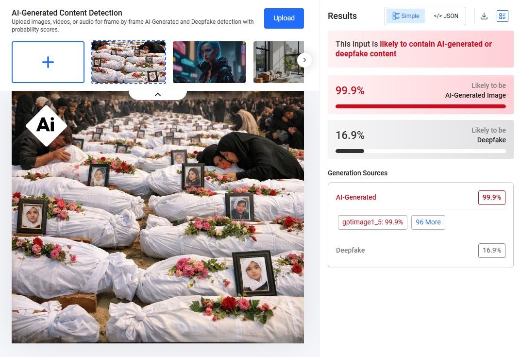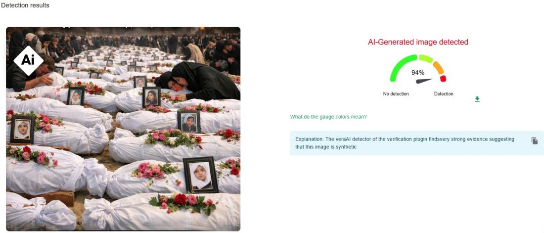 Slično tome, detektor Hive Moderation ukazao je na verovatnoću od 99,9% da je slika generisana pomoću veštačke inteligencije. Detektor veštačke inteligencije AI or Not takođe navodi da je slika "verovatno generisana uz pomoć AI-ja".