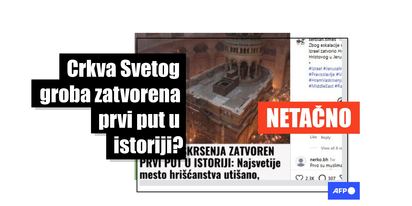 Nakon izbijanja rata na Bliskom istoku izraelske vlasti zatvorile su sveta mesta u Starom gradu Jerusalima. U tom kontekstu, korisnici društvenih mreža tvrde da je Crkva Svetog groba prvi put u istoriji zatvorena na neodređeno vreme i da taj potez predstavlja napad na hrišćane. Međutim, tokom pandemije kovida 2020. godine, ta crkva je bila zatvorena dva meseca, suprotno tvrdnjama da je pristup tada bio samo "ograničen".