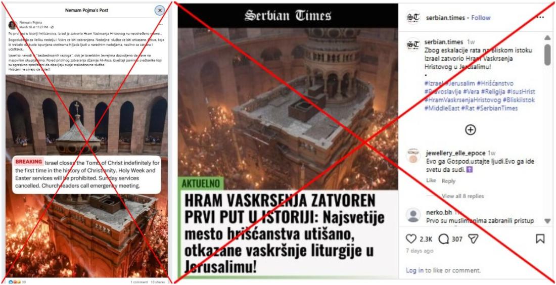 "Zbog eskalacije rata na Bliskom istoku Izrael zatvorio Hram Vaskrsenja Hristovog u Jerusalimu!", piše u opisu posta objavljenog na Instagramu 19. marta 2026. godine koji je od tada podeljen više od 2.000 puta.