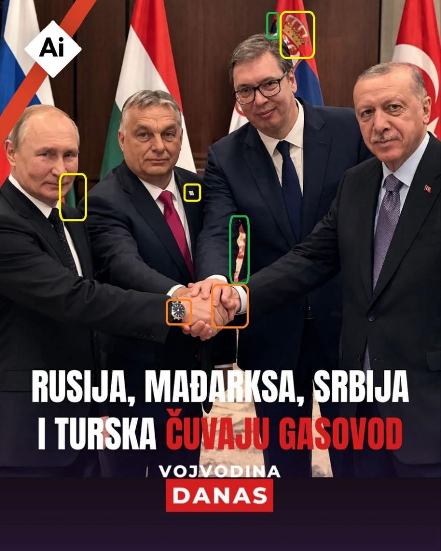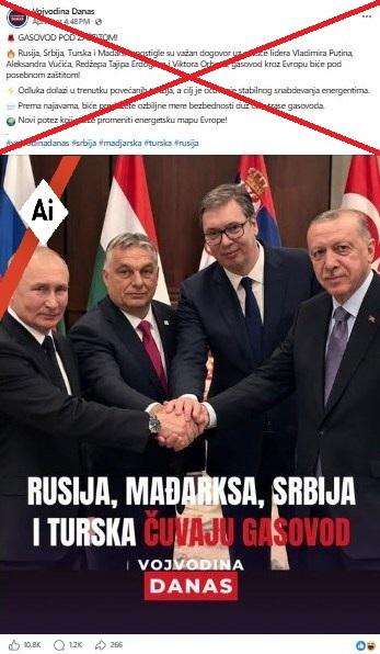 Nedelju dana pre ključnih izbora u Mađarskoj 12. aprila 2026. godine, na kojima je pobedila opoziciona stranka Tisa, predsednik Srbije Aleksandar Vučić saopštio je da je u blizini gasovoda Balkanski tok, kojim se ruski gas transportuje u Mađarsku, pronađen eksploziv. Saopštenje je podstaklo njegovog političkog saveznika, tadašnjeg mađarskog premijera Viktora Orbana, da sazove hitan sastanak Saveta za odbranu. U tom kontekstu, na društvenim mrežama pojavila se fotografija koja prikazuje jedinstvo Vučića i Orbana sa predsednikom Turske Redžepom Tajipom Erdoganom i Rusije Vladimirom Putinom. Uz fotografiju je kružila i tvrdnja da su lideri postigli dogovor o posebnoj zaštiti gasovoda. Međutim, slika je kreirana uz pomoć veštačke inteligencije, a poslednji put su se četvorica lidera sastala 2017. godine u Kini.