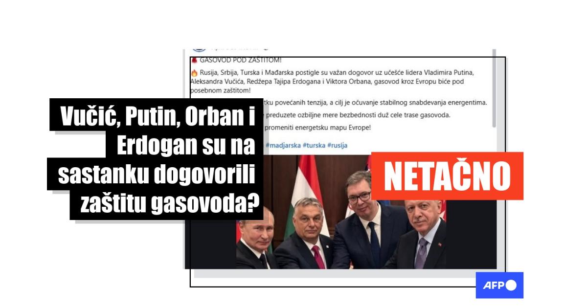 "GASOVOD POD ZAŠTITOM! Rusija, Srbija, Turska i Mađarska postigle su važan dogovor uz učešće lidera Vladimira Putina, Aleksandra Vučića, Redžepa Tajipa Erdogana i Viktora Orbana, gasovod kroz Evropu biće pod posebnom zaštitom!", piše u opisu posta objavljenog na Fejsbuku 6. aprila 2026, koji je od tada lajkovan više od 10.000 puta i podeljen preko 200.