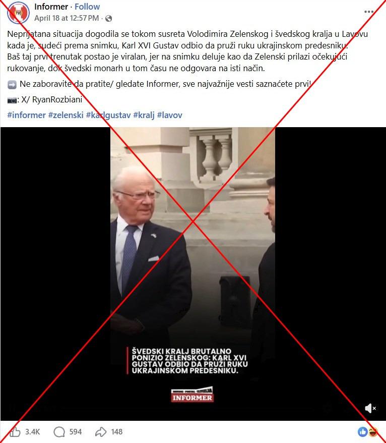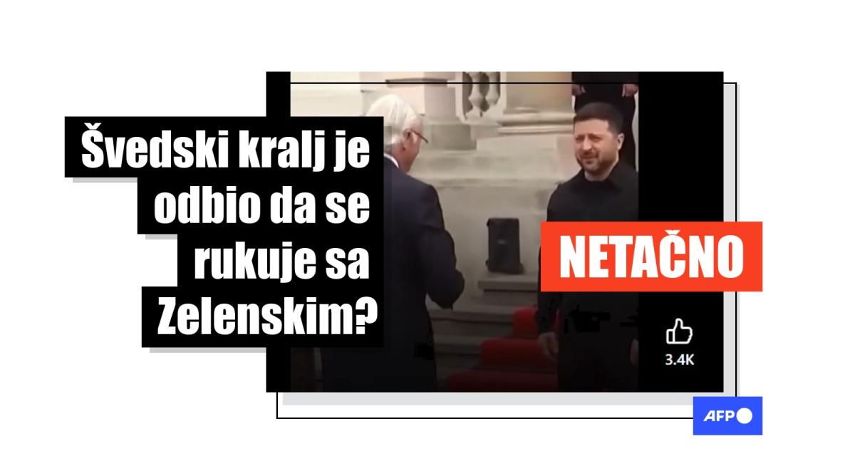 Popularna, često ponavljana tema na proruskim društvenim mrežama jeste tvrdnja da ukrajinskog predsednika Volodimira Zelenskog ignorišu ili odbijaju istaknuti političari i šefovi država. U tom kontekstu, na društvenim mrežama se pojavio video koji navodno prikazuje kako švedski kralj Karl XVI Gustav odbija da se rukuje sa Zelenskim tokom posete ukrajinskom gradu Lavovu u aprilu 2026. godine. Međutim, snimak je manipulisan i montiran tako da izgleda kao da rukovanja nije bilo. AFP-ove fotografije i video zapisi sa lica mesta jasno pokazuju da su se njih dvojica rukovali.