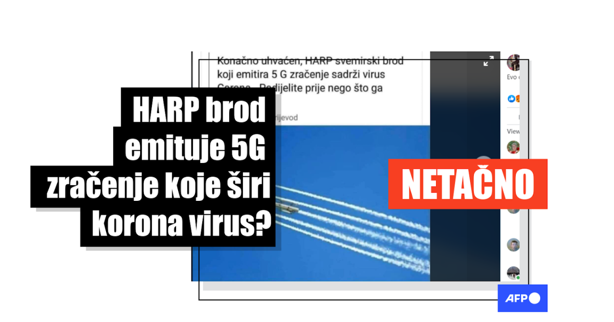 Objava pokazuje fotografiju letećeg objekta na nebu koji ostavlja kondezovane tragove (contrails na Engleskom). Na vrhu fotografije je napisano: “Konačno uhvaćen, HARP svemirski brod koji emitira 5G zračenje sadrži virus Corona.” Čini se da je ova objava na srpskom prvi put postavljena u aprilu 2020. od kada je podeljena više od 52,000 puta. Ponovo se pojavila na Fejsbuku 26. oktobra, 2020. i pregledana je 34,000 puta za samo 24 sata.