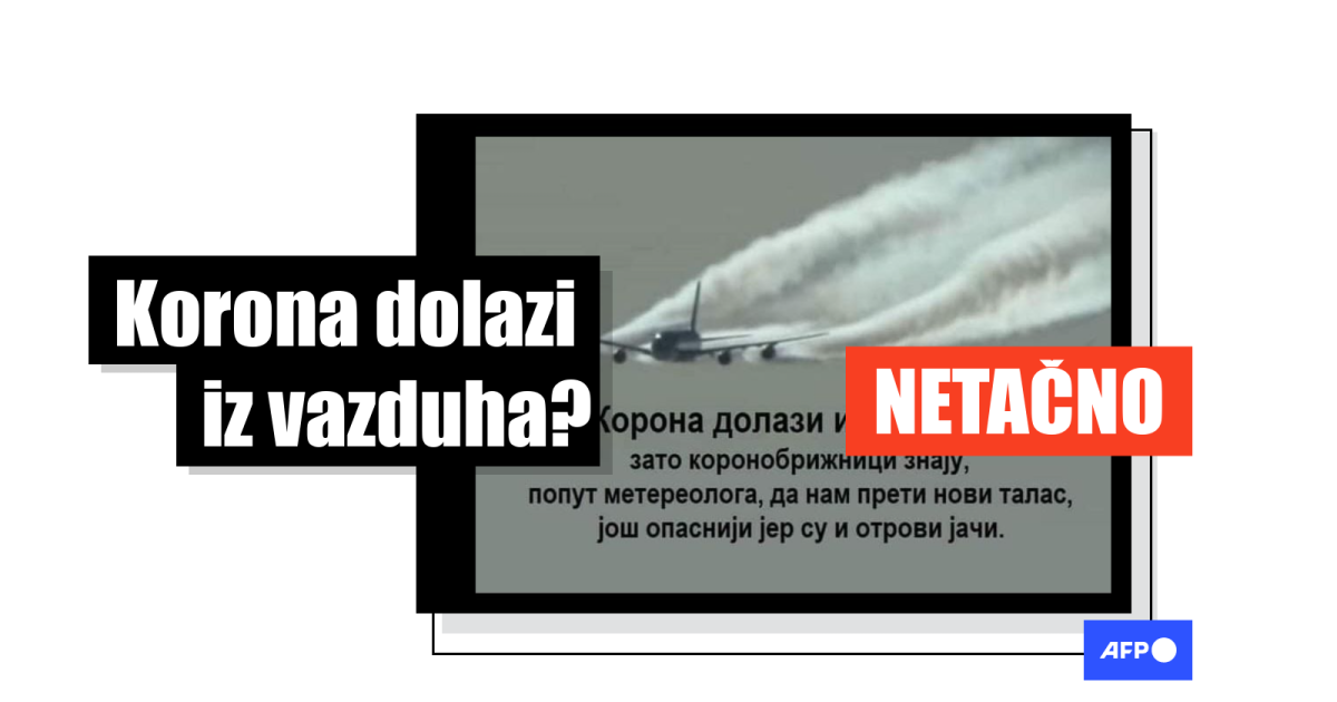 “Korona dolazi iz vazduha, zato koronobrižnici znaju, poput meteorologa, da nam preti novi talas još opasniji jer su i otrovi jači,” navodi se u tekstu na fotografiji aviona u letu koji za sobom ostavlja kondenzovane tragove. Prema podacima Fejsbuka fotografija je od 17. februara u objavama poput ove i ove podeljena na ovoj društvenoj mreži ukupno 7.300 puta. U nekim objavama korisnici su ponovili teoriju zavere da je korona virus napravljen u laboratoriji, dok su drugi naveli da “novi talas stiže sa novim sojem iz Afrike.”