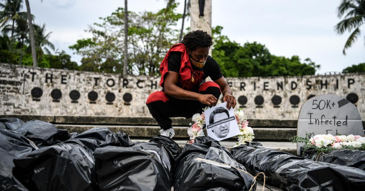 Slika AFP-a sa istog protesta dokazuje da je on održan da bi se odala počast životima izgubljenim u pandemiji novog korona virusa i da se guverner Floride Ron DeSantis i američki predsednik Donald Tramp pozovu na odgovornost zbog načina na koji rešavaju zdravstvenu krizu.