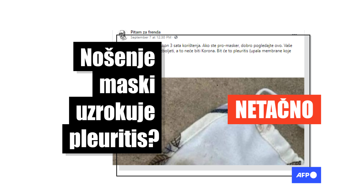 Slika objavljena uz tekst sugeriše da bi deca mogla da razviju pleuritis zbog nošenja prljave maske. AFP-ovi servisi za proveru činjenica su već razobličili nekoliko takvih tvrdnji, na primer da nošenje maski uzrokuje bakteriološke infekcije oko usta, ili da maske uzrokuju bronhijalnu infekciju zbog bakterija izbačenih na masku, a zatim udisanih u pluća.