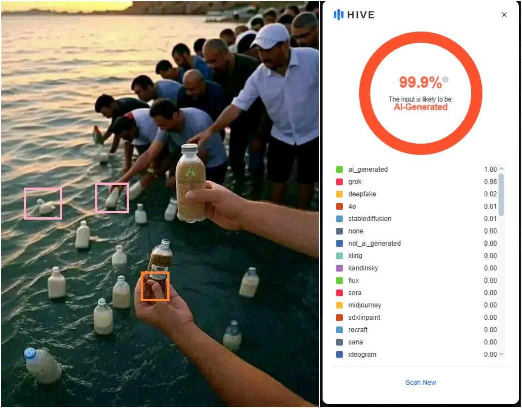 Une analyse effectuée à l'aide de l'outil de détection Hive, spécialisé dans la vérification d'images, a conclu à 99,9 % de probabilité que ces visuels aient été générés par intelligence artificielle.