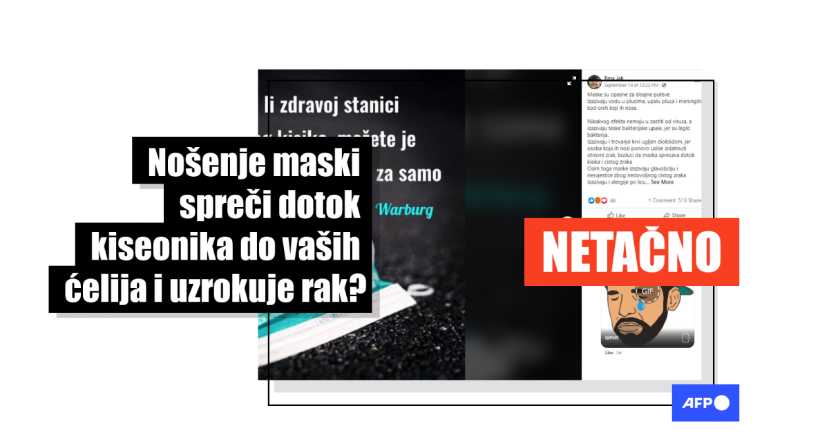 “Oduzmete li zdravoj stanici 35% njenog kisika, možete je pretvoriti u stanicu raka za samo dva dana,” piše na slici medicinske maske, podeljenoj na Fejsbuku više od 600 puta od 18. septembra 2020. godine kada je objavljena. Izjava je pripisana dr. Oto Hajnrihu Varburgu (Otto Heinrich Warburg), dobitniku Nobelove nagrade, koji je umro 1970. godine. Ista slika i izjava dele se i u drugim objavama kao ovde ili ovde u ćiriličnom tekstu i sa drugačijom slikom žene sa maskom. Ista tvrdnja je podeljena na drugim jezicima, na primer na engleskom i na hebrejskom.