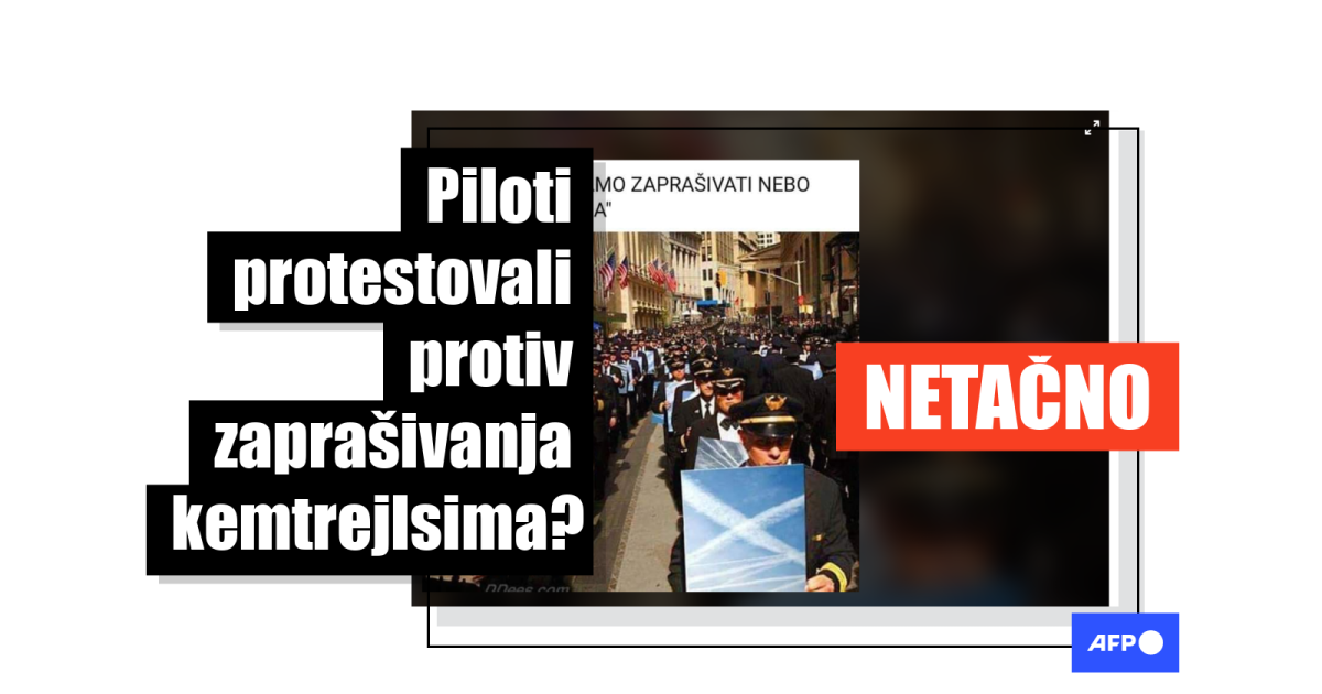 Objavu je jedna korisnica Fejsbuka iz Srbije postavila u julu 2020. ali se ponovo pojavila 22. oktobra, 2020. i od tada je pregledana gotovo 50,000 puta i podeljena 1,200 puta. Objava uključuje fotografiju redova pilota koji nose velike plakate sa slikom neba isprekrštanog, kako se ispostavlja, tragovima pare koje ostavljaju avioni. Na vrhu fotografije stoji natpis: “PILOTI: ‘ODBIJAMO ZAPRAŠIVATI NEBO CHEMTRAILSIMA’.” “Kemtrejls” (na engleskom Chemtrails) je naziv koji koriste ljudi koji veruju da ovi tragovi kondenzacije sadrže opasne hemikalije koje se namerno ispuštaju u zle svrhe.