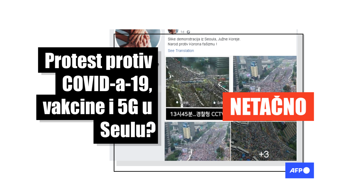 Tačno je da je u Seulu, glavnom gradu Južne Koreje, 15. avgusta, 2020. održan protest. Međutim, ljudi nisu protestovali protiv nošenja maski ili 5G tehnologije. “Hiljade desničarskih demonstranata se okupilo protiv vlade levog-centra predsednika Mun Džae Ina (Moon Jae-In)”, izvestila je AFP.
